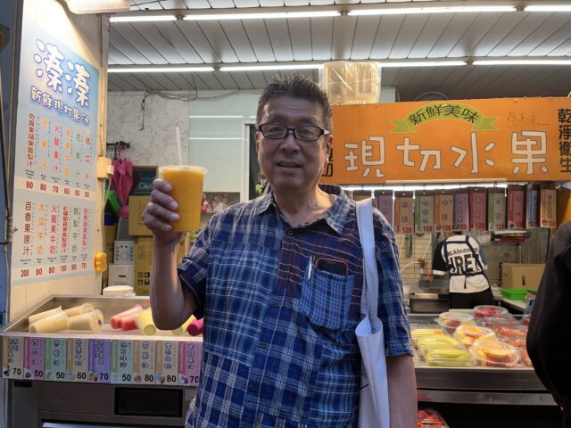 送迎のガイドのお姉さんが、バスの中で、夜市のカットフルーツは、絶対に食べないでくださいと説明してくれていたが、ジュースは、言わなかったものね、と言い訳しながら飲む。
