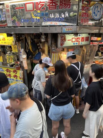 「一口吃香腸」と書かれている焼きソーセージのお店である。