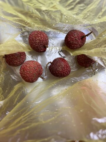 ビールのアテは、昼間に買った生のライチと、スーパーで買ったパパイヤ。