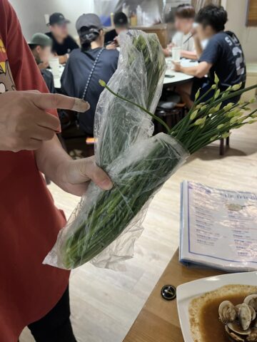 これも、グーグル翻訳で調べたんですが、ニンニクの花?って、どんなだろうと、日本だったら、ニンニクの芽は、中華料理なんかで使うけどね、なので、お姉さんに聞いてみたら、ビールが入れてある縦長のガラス張りの冷蔵庫から、これだよと見せにきてくれた。
