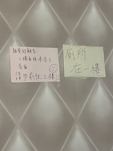 ふと、壁を見たら、台湾の言葉で、トイレは、1階だと張り紙がされてあった。