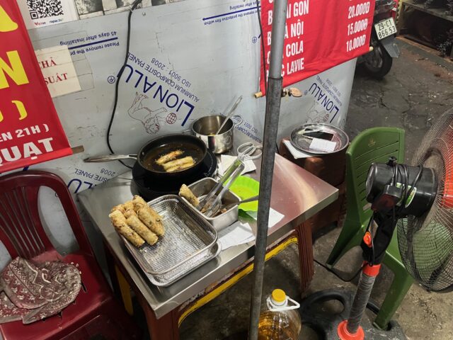 調理は、家の凹んだところにコンロを置いて、おっちゃんが、何かを作っている。また、壁の前にもコンロがあって、こっちは、揚げ春巻きを作っているみたいだ。