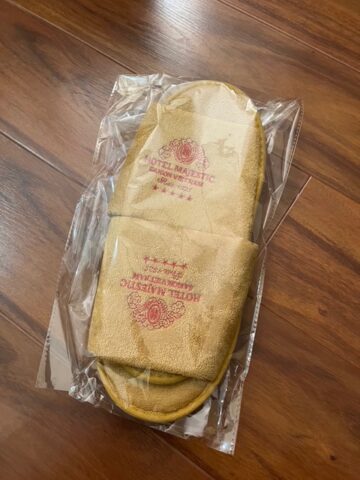 部屋には、使い捨てのスリッパが備え付け絵あったが、ビジネスホテルとは、全く違うふかふかのホテルのロゴの入った高級な使い捨て。